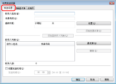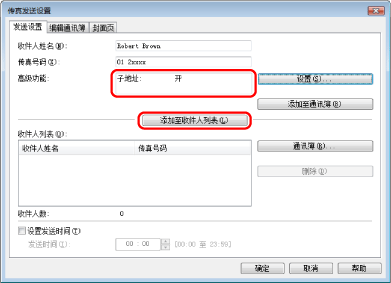 如果在[特殊设置]页的[安全设置]对话框中选择了[请在添加收件人至[收件人列表]前,重新输入传真号码],则单击[添加至收件人列表]时会显示[确认密码]对话框。有关详细信息,请参阅联机帮助。(请参阅“查看联机帮助”)