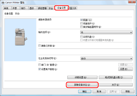 如果通过USB或WSD(设备Web服务)端口连接了打印机和计算机,将无法使用[获取设备状态]功能。需要手动配置这些设置。