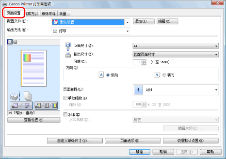 如果无法选择[页面布局]的选项,请显示[设备设置]页,然后从[在主机后台打印]选择[自动]或[启用]。有关如何显示[设备设置]页的说明,请参阅“设置打印机选项”。