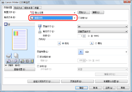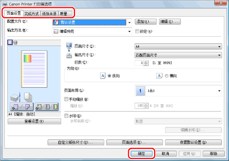 单击[页面设置]、[完成方式]、[纸张来源]和[质量]页的选项卡,然后指定所需的项目。