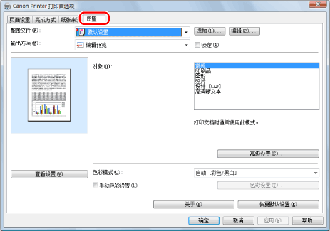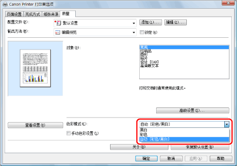 根据数据的类型,[自动[彩色/黑白]]自动在彩色打印和黑白打印之间切换。