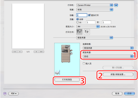 获取打印机信息(打印机型号名称、安装选项和纸张来源状态)。
