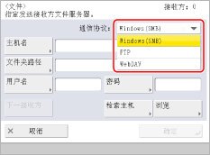 如果选择[Windows(SMB)]作为服务器协议,则可以通过按[检索主机]指定网络上其他机器的“高级存储箱”。有关使用“检索主机”键的说明,请参阅"使用检索主机键[Windows(SMB)]指定文件服务器."