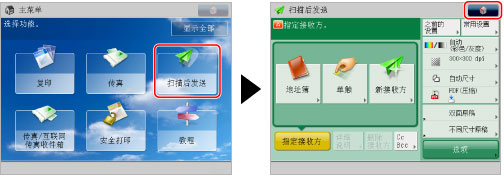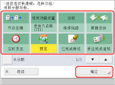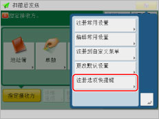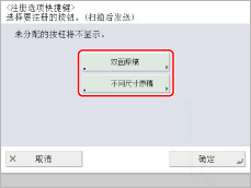 “扫描后发送”屏幕上显示两个选项快捷键。[双面原稿]和[不同尺寸原稿]作为默认设置显示。这些快捷键可以更改为常用的功能。