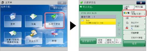 可以将所需色彩模式作为默认值存储到“扫描后发送设置”中的“更改默认设置”中。 (See "更改发送的默认设置.")