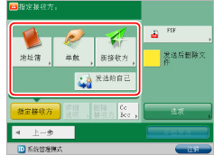 如果“设置/注册”中[功能设置]的[限制新接收方]中的接收方类型设置为“打开”,则不能在[新接收方]中输入该类型的新接收方。使用[地址簿]中的“本地地址簿”、“远程地址簿”、“LDAP服务器”或按[单触]中的单触按钮选择一个已存储的接收方。 (See "限制发送功能.")