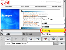 如果将[Privacy Policy and Regulations](隐私策略和规则)中的[Restrict History Display](限制历史记录显示)设置为“On”(打开),则无法显示URL历史记录。 (See "隐私策略和规则设置.")