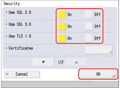 <Use SSL 2.0>(使用SSL 2.0)、<Use SSL 3.0>(使用SSL 3.0)和<Use TLS 1.0>(使用TLS 1.0)都设置为“Off”(关闭)时,无法使用SSL。