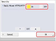 按[Security](安全性)→为<Dsply Mixed HTTPS/HTTP>(显示HTTPS/HTTP混合网页)选择[On](打开)→按[OK](确定)。