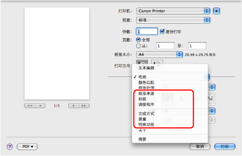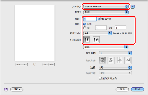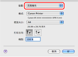 在Mac OS X 10.5.x中,根据所使用的应用程序,可能不显示[页面设置]对话框。如果是这种情况,可以在[打印]对话框中指定纸张大小、打印方向和缩放。
