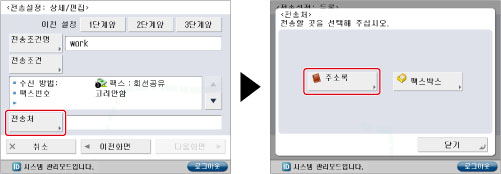 2단계에서 등록된 사무실 B의 팩스 번호를 선택하고 → [확인]을 누르고 → [다음화면]을 누릅니다.