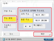 [주소 범위]를 누르고 → [시작 주소]를 누른 다음 '192.31.255.1'을 입력하고 → [종료 주소]를 누른 다음 '192.31.255.254'를 입력한 후 → [확인]을 누릅니다.
