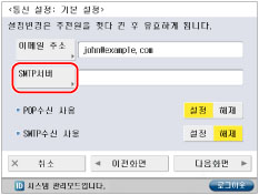SMTP 서버의 IP 주소 또는 이름을 입력하고 → [확인]을 누릅니다.