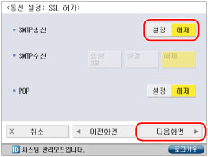 <SMTP 송신> 및 <POP>을 지정하고 → [다음화면]을 누릅니다.