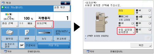 인쇄 대기 중인 예약 작업이 1개 이상인 경우 예약 작업에 대해 지정된 마지막 용지 크기/종류만 용지 선택 화면 및 복사 기본 기능 화면에 표시됩니다.