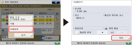 메모리 미디어에 들어 있는 파일에 대한 상세 정보(파일 이름, 위치, 수정 날짜 등)를 확인하고 파일을 추가하거나 삭제할 수 있습니다.