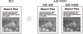 인쇄사진과 같이 하프톤이 포함된 원고를 사진 모드를 사용하여 스캔하는 경우, 모아레(미광, 물결 무늬) 현상이 일어날 수도 있습니다. 이 경우, [낮음] 설정을 사용하여 이러한 모아레 효과를 낮출 수 있습니다.