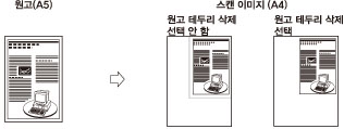 이 모드는 지정한 용지 크기보다 원고가 작은 경우 스캔된 이미지 주위에 생기는 그림자와 테두리 선을 삭제합니다. 이 모드를 사용하여 스캔된 이미지 가장자리 주위에 공백 선을 작성할 수도 있습니다.