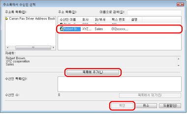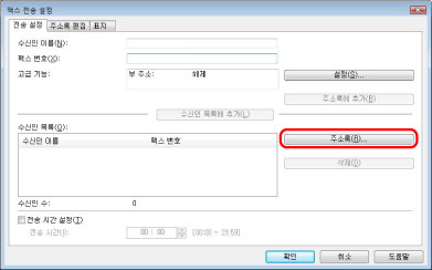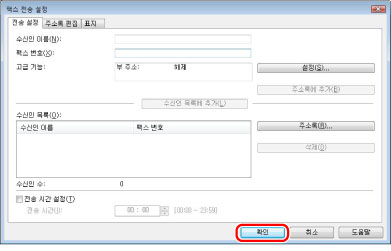 [고급] 시트의 [보안 설정]대화 상자에서 [[수신인 목록]에 수신인을 추가하기 전에 팩스번호 재입력하기]를 선택하면 [수신인 목록에 추가]를 클릭할 때 [비밀번호 확인] 대화 상자가 표시됩니다. 자세한 내용은 온라인 도움말을 참고하십시오. "온라인 도움말 보기"를 참고하십시오.
