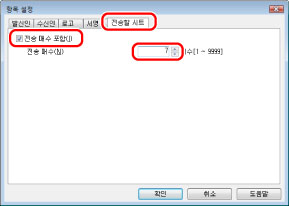 표지에 송신할 매수를 포함하려면 [전송할 시트]를 클릭하고 → [전송 매수 포함]을 선택한 후 → 매수를 지정합니다.