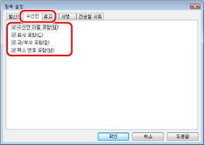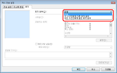 [표지 첨부]에서 팩스에 표지를 첨부할 수 있는 옵션을 선택합니다.