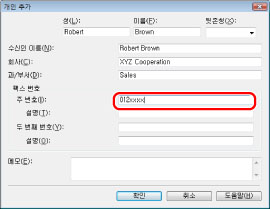 단일 개인 수신인에 대해 두 가지 팩스 번호를 지정할 경우 동일한 이름의 두 팩스 번호가 주소록에 표시됩니다.