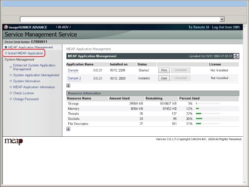 2.5인치/80GB HDD를 사용하여 메모리를 확장하는 경우 1GB로 사용할 수도 있습니다. [MEAP Application Management] 페이지에 표시된 [Resource Information]의 [Storage]에서 MEAP 응용 프로그램에 할당된 메모리를 확인할 수 있습니다.