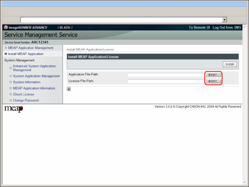 http://www.canon.com/lms/license/ 온라인 지침을 따라 라이센스 파일을 만들고 다운로드합니다. 라이센스 작성 절차를 완료하려면 라이센스 액세스 번호와 MEAP 기기 일련 번호가 있어야 합니다. 응용 프로그램에 라이센스 액세스 번호가 없는 경우 MEAP 응용 프로그램 제공업체가 라이센스 파일을 제공합니다. 자세한 내용은 응용 프로그램과 함께 제공된 설명서를 참고하십시오.