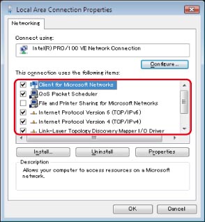 [로컬 영역 연결 속성] 대화상자에서 [Microsoft 네트워크용 클라이언트] 및 [인터넷 프로토콜(TCP/IP)]/[인터넷 프로토콜 버전 4(TCP/IPv4)]를 모두 선택합니다.