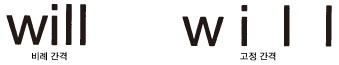 각 문자의 폰트는 지정된 포인트 크기에서 각 문자마다 다른 폭을 가질 수 있습니다. 예를 들어, W는 I보다 폭이 더 넓은 문자입니다. 폭이 다른 문자를 인쇄하는 데에는 두 가지 방법이 있습니다. 첫 번째는 실제 폭과 상관 없이 같은 간격으로 모든 문자를 인쇄하는 것이고, 두 번째는 이렇듯 다양한 폭을 수용할 수 있도록 문자 간 간격을 변경하는 것입니다. 모든 문자를 동일한 간격으로 인쇄하는 것을 고정 간격(Fixed spacing)이라고 하고, 다른 문자 간격을 수용할 수 있도록 간격을 변경하는 것을 비례 간격(Proportional spacing)이라고 합니다.