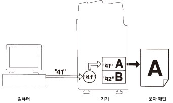 글자 A를 인쇄하는 경우, 호스트 컴퓨터는 A(16진수 41이 이러한 예)에 해당하는 코드를 기기로 전송합니다. 이 코드를 문자 코드라고 합니다. 기기는 각 문자의 내부 표현을 저장한 다음, 이러한 문자 패턴 중에서 수신한 코드에 해당하는 패턴을 선택합니다. 이런 경우에 기기는 A에 해당하는 패턴을 검색하여 인쇄합니다. 글자를 인쇄하는 과정은 다음과 같습니다.