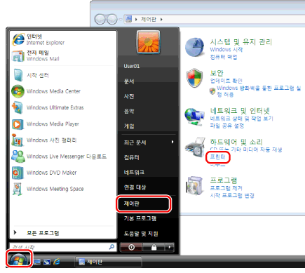 ] (시작) → [제어판] → [프린터]를 클릭합니다.