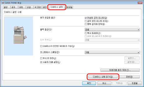 USB 또는 WSD(Web Services on Devices) 포트를 통해 프린터와 컴퓨터가 연결된 경우 [디바이스 상태 얻기] 기능을 사용할 수 없습니다. 설정을 수동으로 구성해야 합니다.