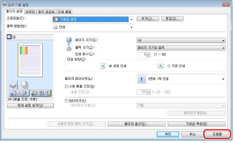 프린터 드라이버 화면에서 [도움말]을 클릭하여 온라인 도움말을 표시할 수 있습니다.