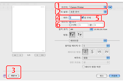 Mac OS X 버전 10.4.x에서는 위의 기능이 [부수 및 페이지수] 환경 설정 창에 표시됩니다. 위의 설정이 이미지의 해당 번호로 표시되는 위치에서 구성됩니다.
