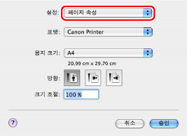 Mac OS X 10.5.x에서 [페이지 설정] 대화상자는 응용 프로그램에 따라 다릅니다.