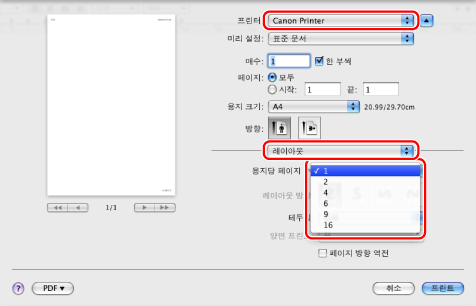 프린터를 선택하고 → [레이아웃]을 클릭한 후 → [용지당 페이지]에서 용지 한 장에 인쇄할 페이지 수를 선택합니다.