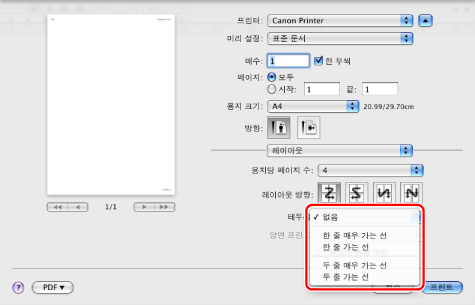각 페이지에 테두리를 추가하려면 [테두리]에서 선 종류를 선택합니다.