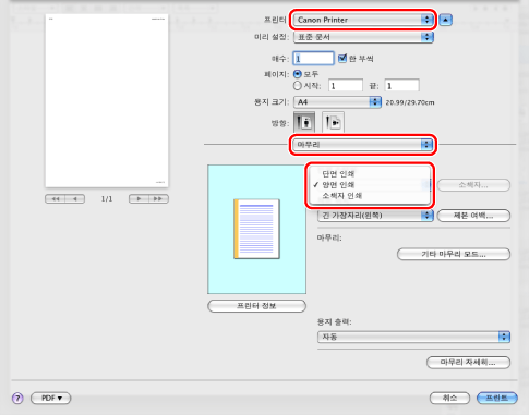 프린터를 선택하고 → [마무리] → [인쇄 스타일]에서 [양면 인쇄]를 선택합니다.