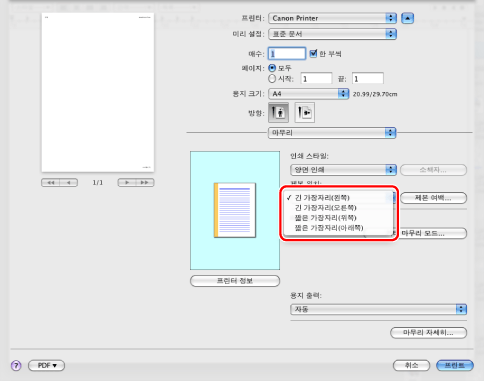 [제본 위치]에서 제본 가장자리를 선택합니다.