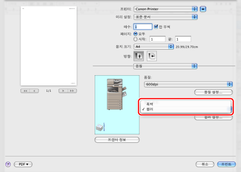 인쇄 데이터를 출력하는 동안 컬러 인쇄와 그레이스케일 인쇄 간에 전환할 수 있습니다.