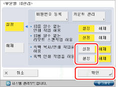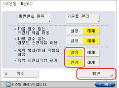부문 ID 및 비밀번호 입력 화면이나 컨트롤 카드 삽입 화면에 [흑백복사/인쇄]를 표시하지 않으려면 <흑백 복사/인쇄 작업을 허용>을 '해제'로 설정합니다.