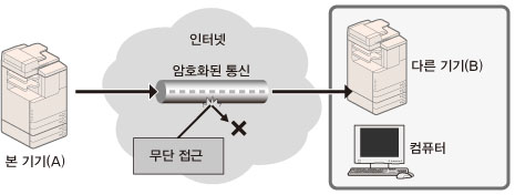 서버 증명서를 기기에 설치하면 웹 브라우저를 통해 기기에 액세스하려 할 때 안전 암호화 통신을 수행할 수 있습니다. SSL 통신에서는 서버 증명서와 공개 키를 사용하여 기기와 사용자만 사용할 수 있는 공통 키가 생성됩니다. 이렇게 하면 데이터 도난 및 가로채기를 방지할 수 있습니다.