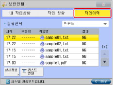 취소된 작업은 작업 이력 화면에 <NG>(No Good)로 표시됩니다.