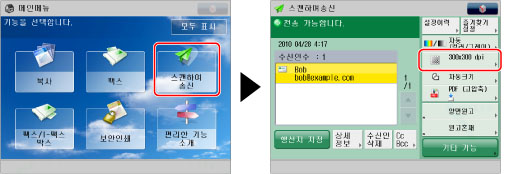 [스캔하여 송신]을 누르고 → 수신인을 지정한 후 → 해상도 버튼을 누릅니다.