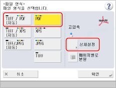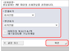 스캔한 PDF 파일을 인쇄하거나 편집하기 위한 비밀번호를 설정하려면 [문서의 권한변경에 비밀번호가 필요]를 선택합니다. 이 키를 선택하는 경우 <인쇄허가>, <변경허가> 및 <이미지의 복사/추출/액세스빌리티를 가능하게 함> 등 상세 설정을 지정할 수 있습니다.