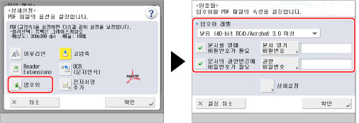 이 모드를 사용하면 보안 강화를 위해 이메일 주소 또는 파일 서버로 송신하는 PDF 파일을 암호화할 수 있습니다.