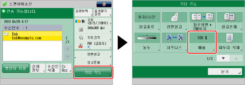 PDF(아웃라인), PDF(고압축), PDF(OCR), XPS(고압축), XPS(OCR)를 파일 형식으로 선택하는 경우 [1:1(100%)] 또는 [자동] 배율로만 송신할 수 있습니다.
