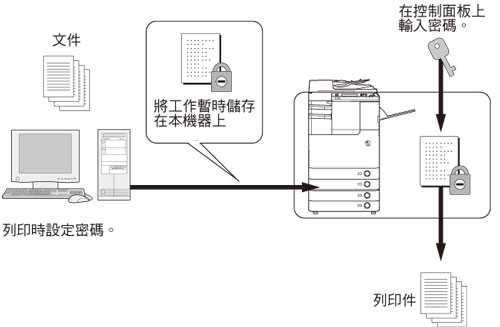 必須再次輸入密碼才能從本機器列印。文件設定了密碼以後,記下該密碼並妥善存放。