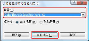 從<裝置>下拉清單,選擇Color Network ScanGear→按一下[自訂插入]。